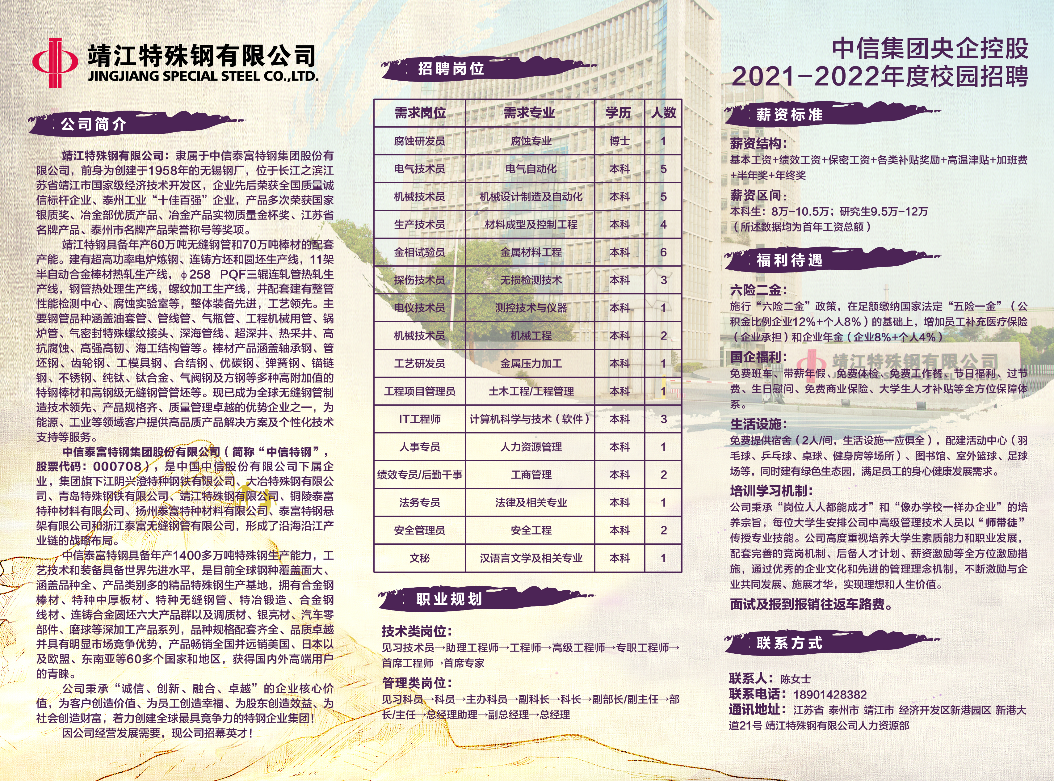 靖江特殊钢有限公司:隶属于中信泰富特钢集团股份有限公司,前身为创建于1958年的无锡钢厂,位于长江之滨江苏省靖江市国家级经济技术开发区,企业先后荣获全国质量诚信标杆企业、泰州工业“十佳百强”企业,产品多次荣获国家银质奖、冶金部优质产品、冶金产品实物质量金杯奖、江苏省名牌产品、泰州市名牌产品荣誉称号等奖项。招聘需求见附件: